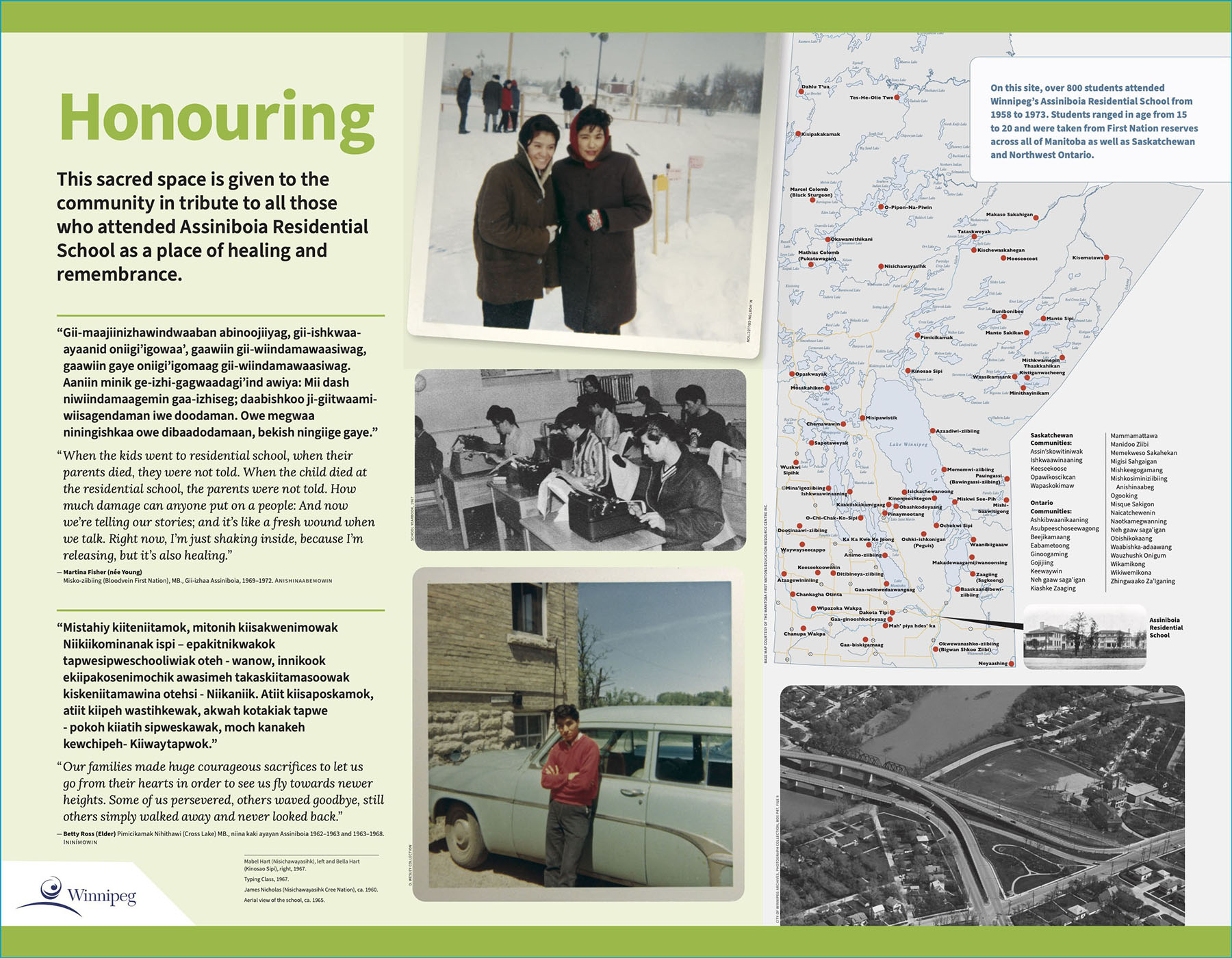 The Assiniboia Residential School Commemorative Monument & Gathering Place was inaugurated on September 30th, 2022. The Assiniboia Residential School Legacy Group now leases the land underneath the Monument, but it is only a small portion of the former school site that once included a classroom building, girls’ and boys’ dormitories, auditorium, chapel and sports fields.